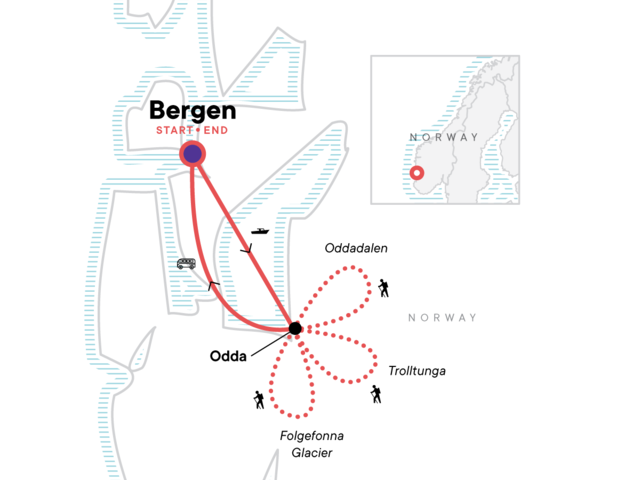 Your Welcome Moment: Welcome Moment - Meet Your CEO and Group. Orientation walk in Bergen. Hike and climb the Via Ferrata route to Trolltunga. Guided glacier hike with crampons and ice axes. Hike in the Buerdalen valley. Free time to explore Odda.