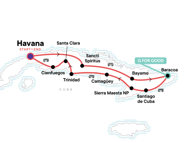 Your Hands-On Moment: Salsa Lesson, Trinidad. Arrival transfer. Che Guevara mausoleum and museum visit. Beach time in Baracoa. Comandancia de la Plata hike. Havana city tour in vintage car. Old Havana walking tour. Orientation walks in Sancti Spíritus, Santiago de Cuba, Baracoa, Camagüey, Cienfuegos, and Trinidad. Free time in Bayamo, Santiago de Cuba, Trinidad, Bay of Pigs, and Havana. Informal Spanish lesson. All transport between destinations and to/from included activities.